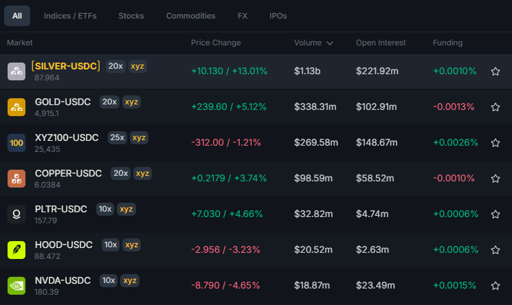 TradeXYZ is essentially a “sub-exchange” that uses the Hyperliquid L1. It uses HL’s orderbook but manage its own listings and oracle. The flagship product is XYZ100 which is an onchain Nasdaq 100, but Silver has recently taken over as the most traded tokenized asset on TradeXYZ.